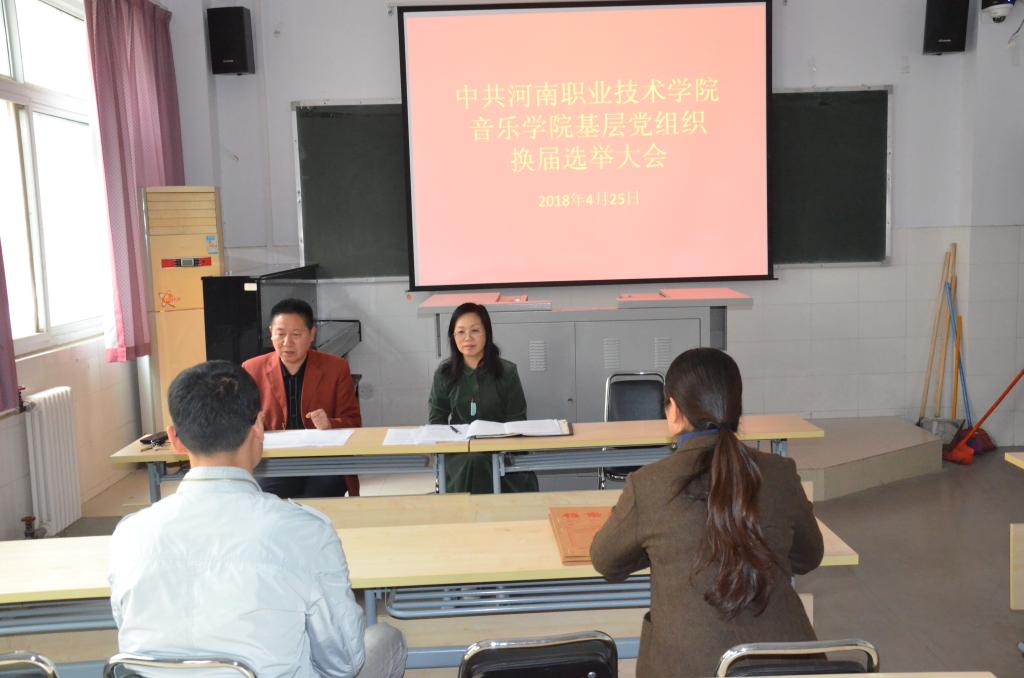 4月25日中午13点,音乐学院在A208教室隆重召开中共河南职业技术学院音乐学院基层党组织换届选举大会。音乐学院共有师生党员43人,实到35人(其中正式党员33人,实到27人),符合大会规定。大会由江团结副院长主持,学校李玉峰副校长全程参加。