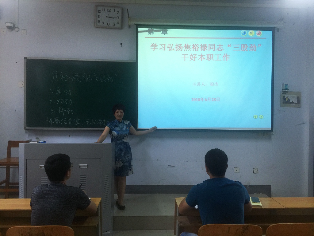 下午3:00在二号教学楼2105教室,科技开发处(资产经营管理办公室)党支部书记梁杰为支部全体党员上了主题为“学习弘扬焦裕禄同志‘三股劲’——干好本职工作”党课,支部书记梁杰结合部门工作实际谈到“三股劲”——服务师生的那股亲劲、干好工作的那股韧劲、干好事业的那股拼劲,始终保持廉洁奉公,乐于奉献,为大家讲解并揭示了焦裕禄精神的深刻内涵。